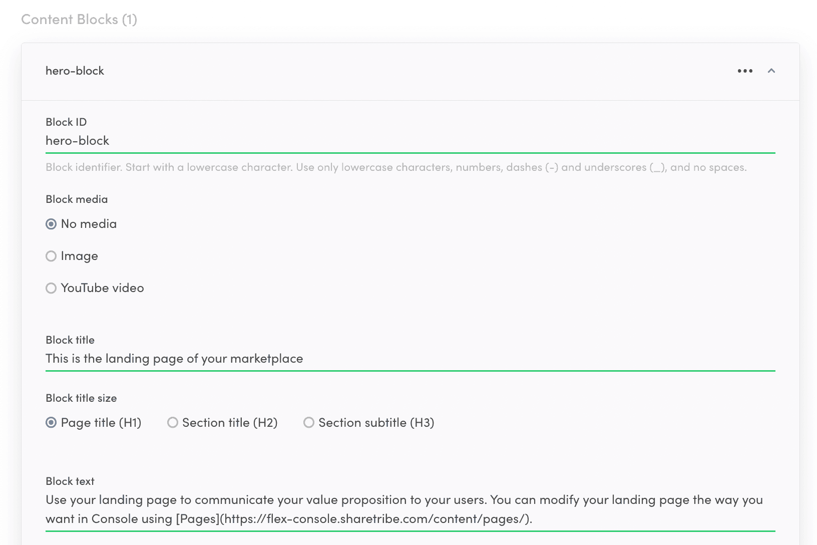 Once you click the link, you can see the default sections for the landing page. You can freely modify, add, and remove the sections as you develop your marketplace.